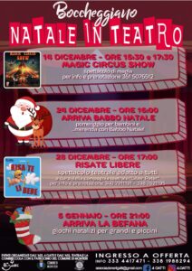 Il Teatro Comunale di Boccheggiano ospita 4 eventi per trascorrere in allegria le festività Natalizie con spettacoli ed iniziative adatte a grandi e piccoli. Domenica 14 dicembre ore15.30 e 17.30 Magic Circus Show Mercoledì 24 dicembre ore 16.00 Arriva babbo Natale e merenda per bambini Domenica 28 dicembre Risate libere Spettacolo teatrale adatto a tutti Lunedì 5 gennaio 2026 ore 21.00 arriva la Befana e giochi natalizi per grandi e piccoli. tutti gli spettacoli sono con ingresso a offerta